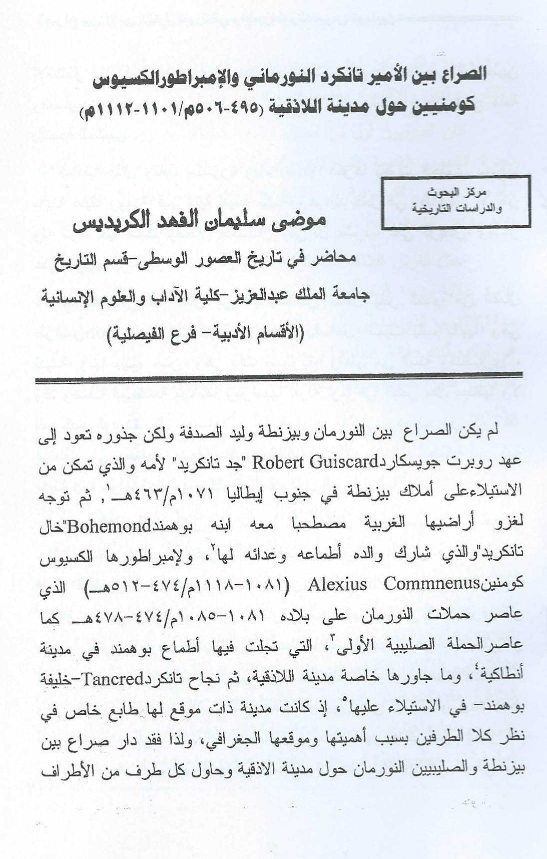 الصراع بين الأمير تانكرد النورماني و الإمبراطور الكسيوس كومنيين حول مدينة اللاذقية(495-506هـ/1101-1112م)