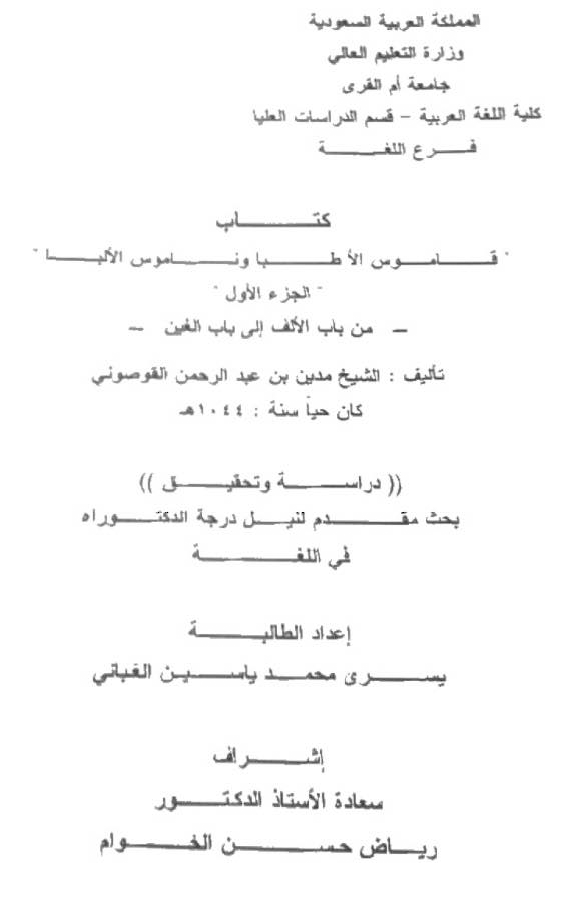 كتاب قاموس الأطبا وناموس الألبا تأليف الشيخ مدين القوصوني ، دراسة وتحقيق .